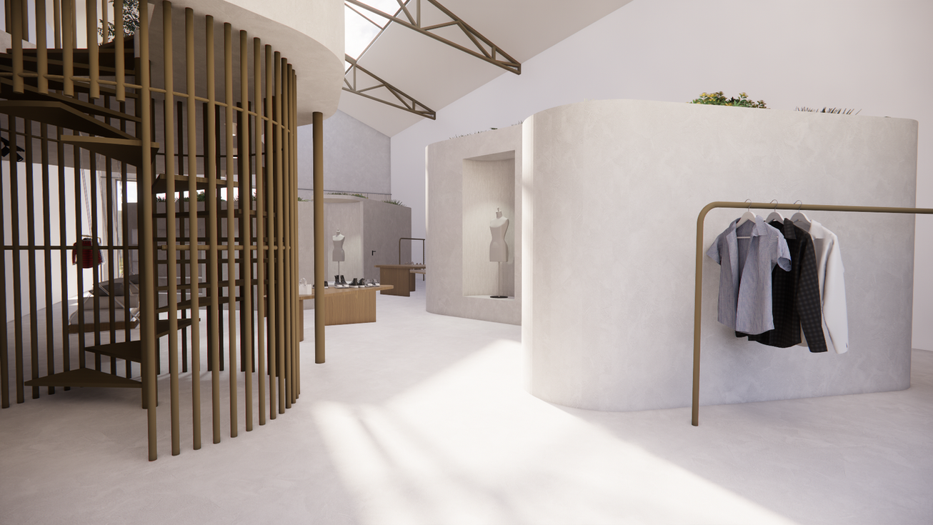 Concept kleurrijke kleding winkel. De organische vormen begeleiden doorheen het ontwerp. De kleding staat centraal, dus is het kleurenpalet rustig. De accenten nemen inspiratie van een speeltuin.